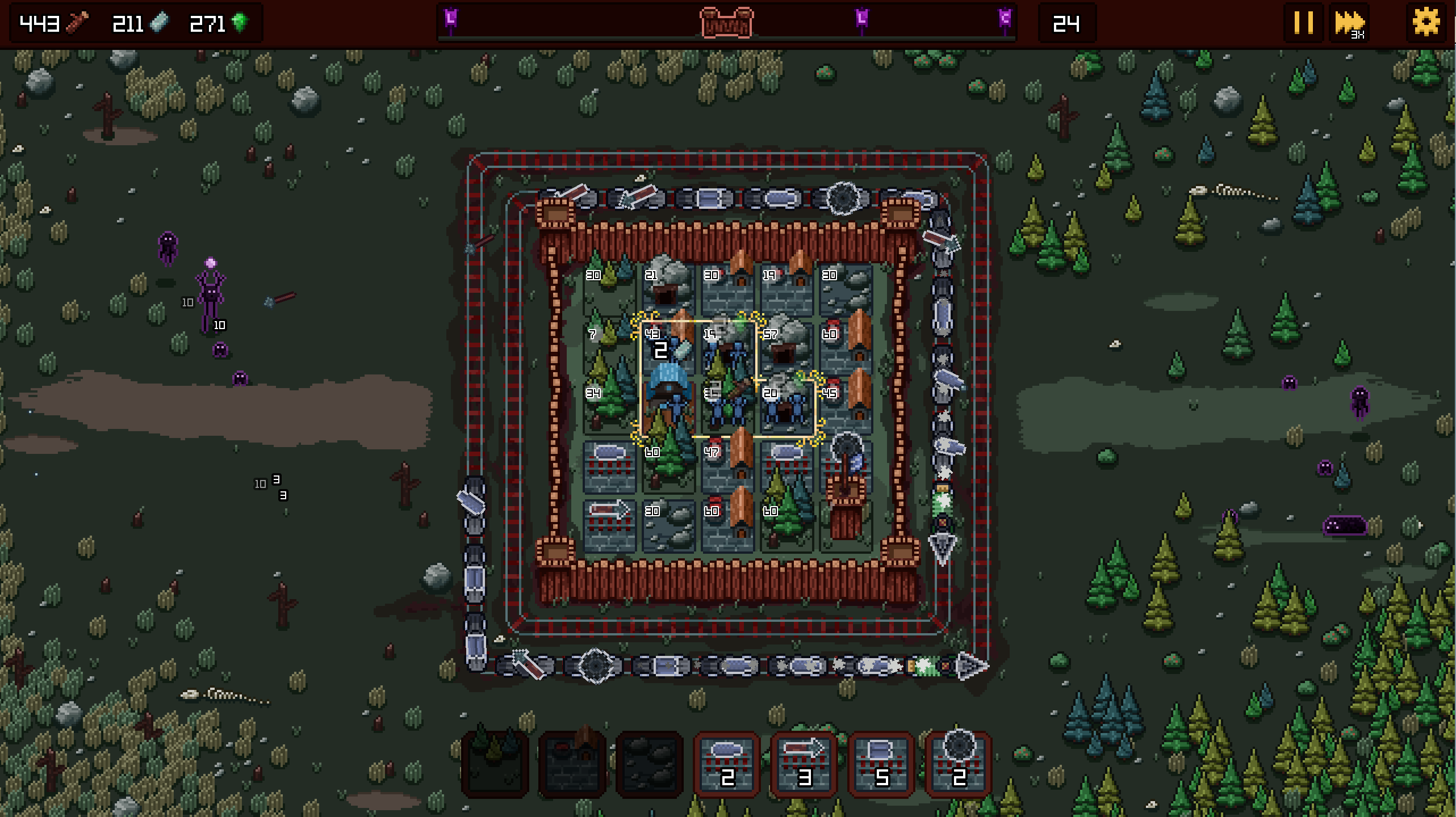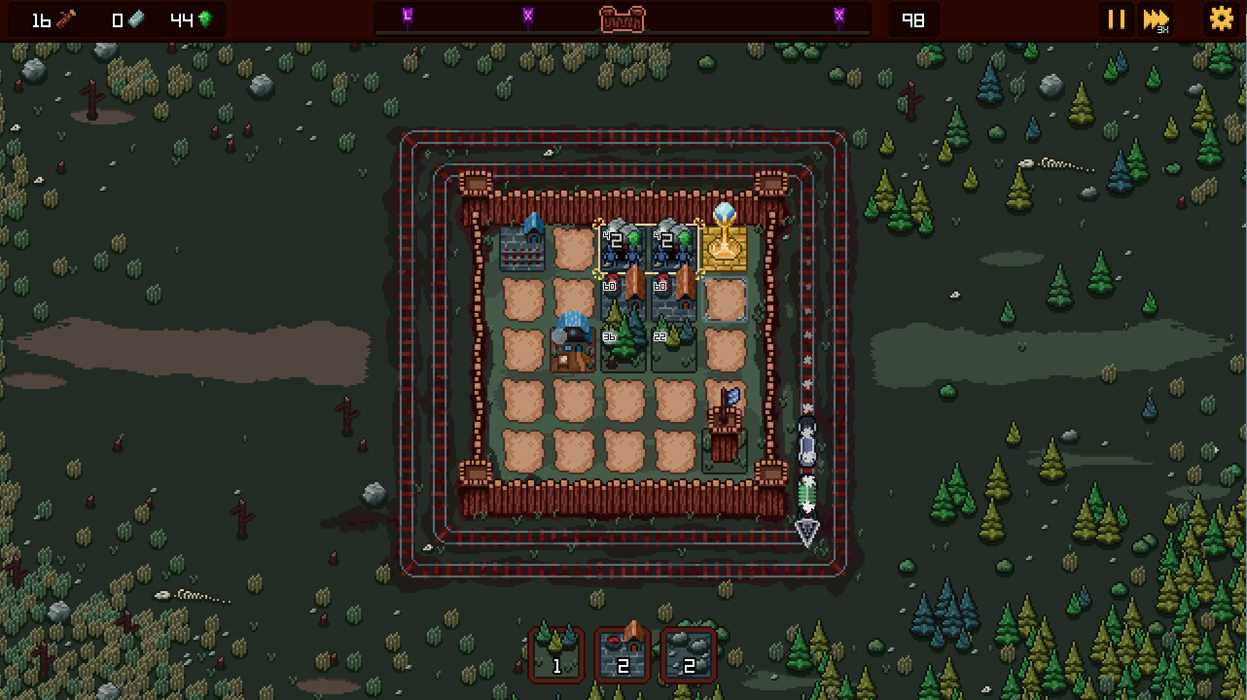 Much like the game this is inspired by, you must place buildings onto the 5x5 grid to build them. However, the buildings are only active or producing a result if the gold cursor selection box is surrounding the buildings in the fortress. You can move the gold selection area by left mouse clicking and dragging to a new location. The golden selection area can also be rotated to better fit an area by using the R key. The gold selection area is vital to gameplay and can be upgraded using the Golden tower.